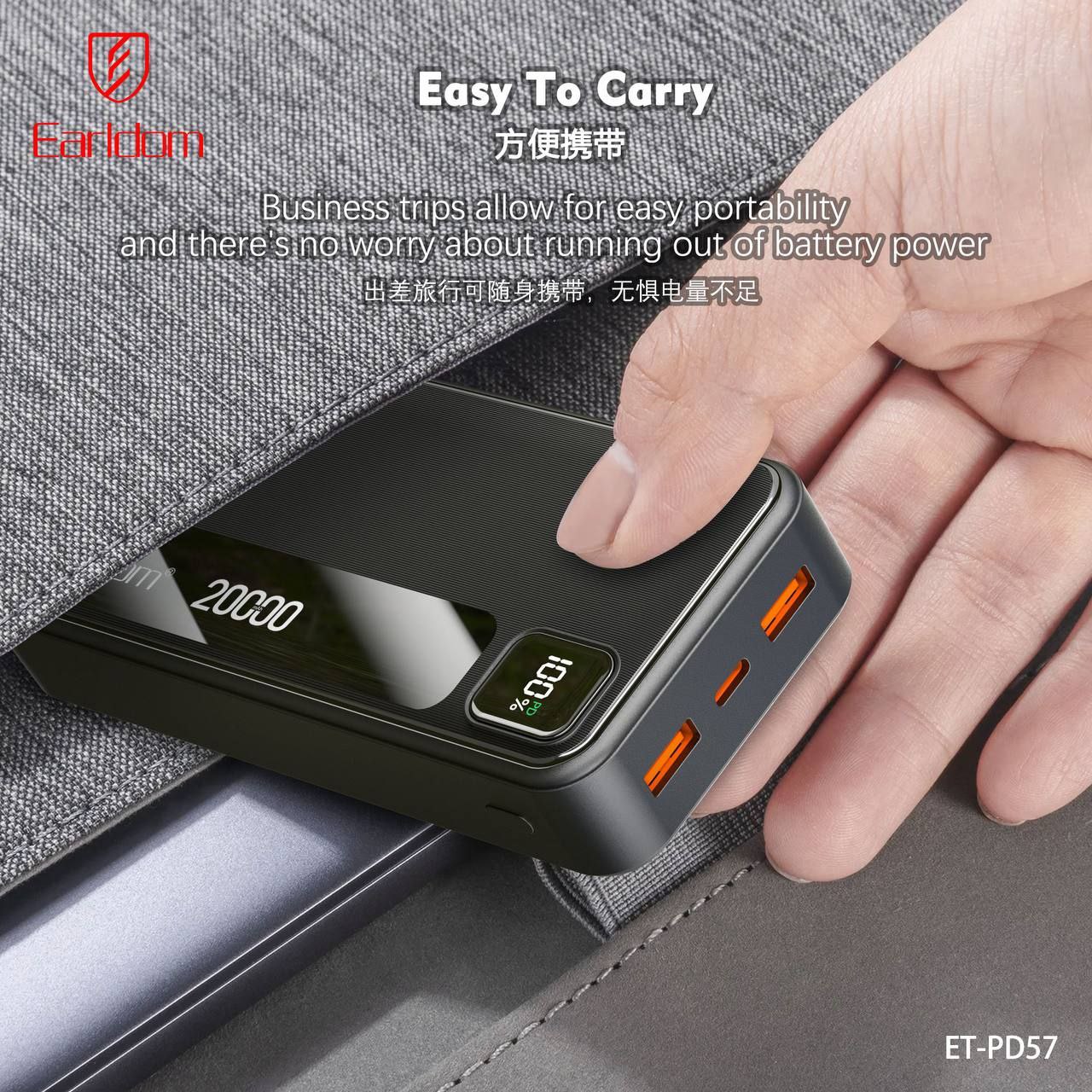 پاوربانك Earldom مدل PD57 20,000 mAh توان 22.5W سوپر فست شارژ ظرفيت واقعي صفحه ديجيتال داراي دو خروجي USB يك خروجي PD كيفيت بسيار بالا ضد آب
