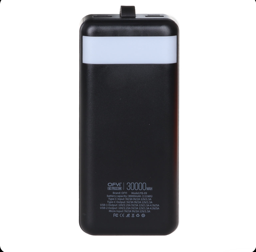 پاوربانک اوفی مدل Ofyi PB-09 30000 دارای ظرفیت 3000 میلی آمپر ساعت به همراه پشتیبانی از فناوریهای شارژ سریع QC3.0 و Power Delivery در کنار توان 22.5 وات با سرعت مطلوبی تلفن همراه شما را شارژ میکند. از طرفی برخورداری از تکنولوژی شارژ ایمن (MultiProtect) از دستگاه شما در برابر نوسانات و لتاژ و اتصالات کوتاه محافظت میکند. این محصول دارای دو پورت ورودی یک عدد میکرو USB و دیگری تایپ سی میباشد که میتوانید آن را به وسیله این پورت ها شارژ کنید.