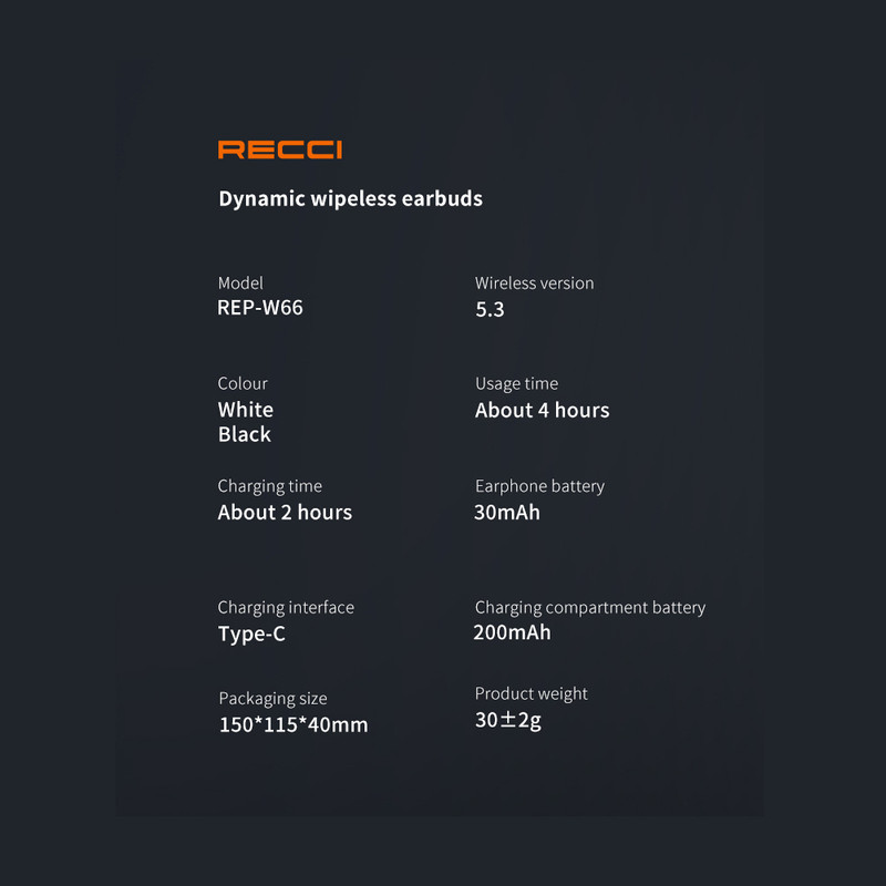 درایورهای 10 میلیمتری و تیونر حرفه ای در هندزفری بلوتوثی رسی Recci REP-W66 Dynamic صدای با کیفیت بدون افت و باسی عمیق را در دسترس شما قرار می دهد. تکنولوژی نویز کنسلینگ نیز هر گونه نویز اضافی در صدا را از بین می برد و صدایی شفاف و واضح در اختیار شما می گذارد. هدفون ها قابلیت تاچ داشته و منطقه لمسی چندمنظوره می تواند موسیقی را پخش و متوقف کند، آهنگ ها را بالا و پایین کرده و به تماس ها پاسخ دهد. این هندزفری بلوتوثی از نسخه بلوتوث 5.3 پشتیبانی کرده و با تمامی دستگاه های اندرویدی و IOS سازگار بوده و علاوه بر اتصالی پایدار در محدوده 10 متری، سیگنال قوی تر، انتقال سریع تر و مصرف انرژی کمتر را برای شما به همراه دارد.
